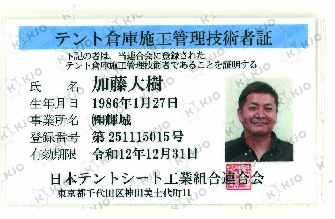 ■資格概要 資格名:テント倉庫施工管理技術者 資格取得者:加藤大樹 資格取得年月日:令和7年11月 登録番号:第251115015号 有効期限:令和12年12月31日 資格認定機関:日本テントシート工業組合連合会